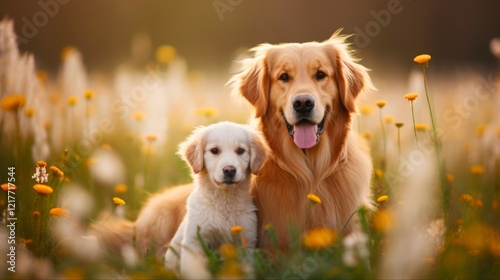 Golden Retriever Dog Mom and Puppy Enjoying a Beautiful Spring Walk Among Colorful Flowers