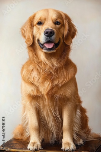 Golden retriever dog sitting on a wooden surface with a happy expression against a plain light background
