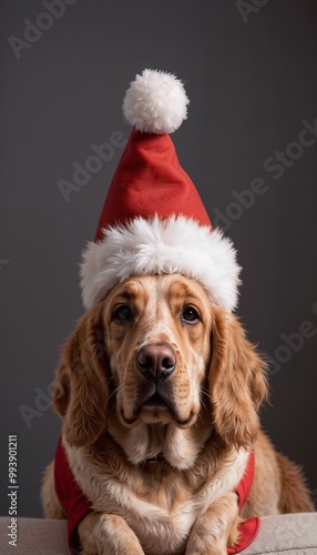 Golden retriever dog wearing Santa hat and Christmas sweater in festive mood, studio background