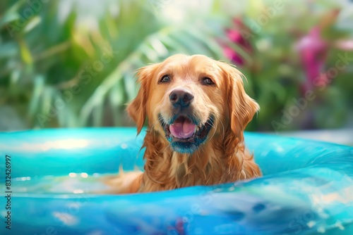 Golden Retriever Enjoying a Swim in a Blue Inflatable Pool