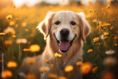 golden retriever, dog, flower, field, nature, pet, sunlight, happy, bloom, yellow flower, canino, springtime, portrait, animal, joy, playful, serene, landscape, blossoming, vibrant color