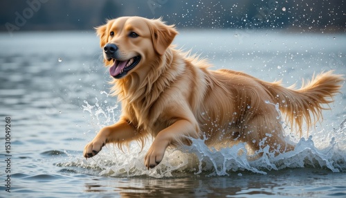 gold, retriever, lake, water, splashing, playing, dog, nature, afternoon, sunlight, joyful, pet, canino, animal, recreation, happiness, action, fur, wet, excitement, running, leisure, scenery, ripple, reflections, wildlife, summer, swimming, environment, animal, fun, companionship, friendly, energetic, playful, adventure, lakefront, relaxation, exercise, blue, sky