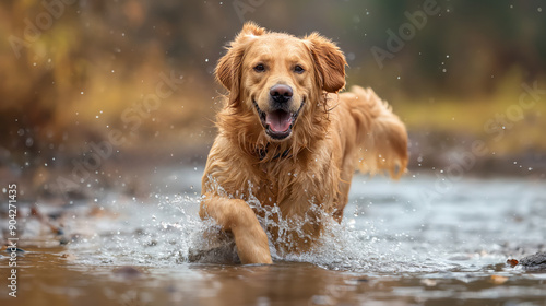 Golden retriever joyfully running through water, splashing and playing on an autumn day.
