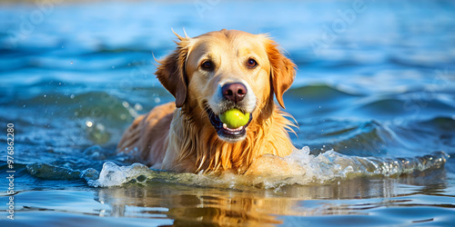 Golden Retriever playing fetch in the water with a tennis ball, dog, pet, canine, retriever, golden, water, running, play, fetch
