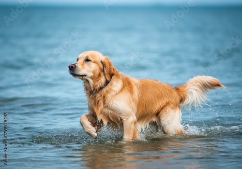 golden retriever, dog, pet, playful, water, beach, nature, animal, swimming, retriever, fun, happy, summer, canino, furry, shoreline, splash, exploring, adventure, wildlife, environment, motion, vibrant, coastal, blue skies, innocence, joyful, running, moment, ocean, calmness, scenic