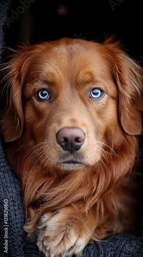 golden retriever, dog, puppy, portrait, pet, animal, canino, blue eye, furry, adorable, cute, majestic, loyal, companion, friends, gold, closeup, head shot, brown dog, long hair, fluffy, dark background, studio shot, beautiful eyes, expression, gaze