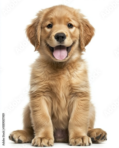 Golden Retriever Puppy: A captivating portrait of a golden retriever puppy, radiating pure joy with its tongue out and a playful smile. The puppy's soft fur, bright eyes.