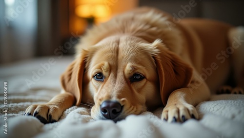 Golden retriever puppy brown eyes lying down looking sad close-up photo, perfect for pet care, animal emotions, veterinary ads, cozy home background, warm soft lighting, indoor mood, comforting atmos