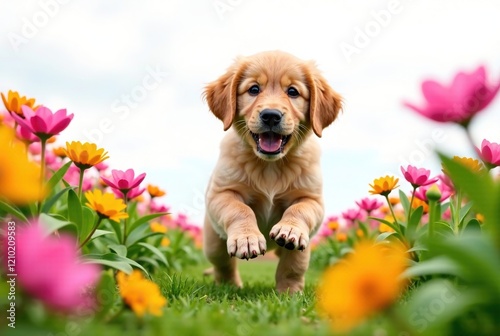 Golden Retriever Puppy in Flower Field - Playful Pup