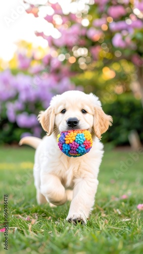 Golden retriever puppy running towards camera, carrying a colorful ball, in a garden with blooming lilac bushes