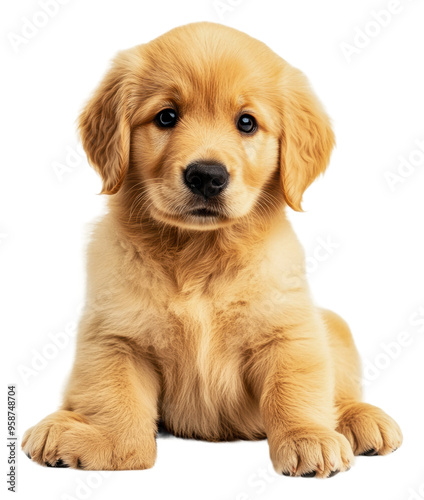 Golden retriever puppy sitting calmly indoors, cut out - stock png.