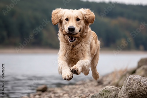 golden retriever, dog, running, lakeshore, treat, pet, playful, nature, joyful, motion
