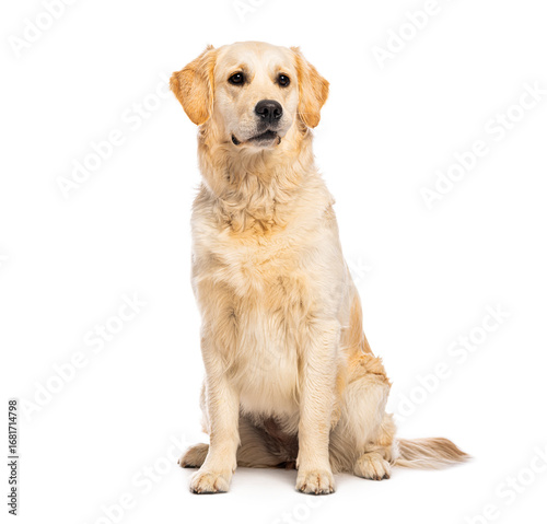 dog, golden retriever, pet, animal, canino, mammal, cute, domestic, purebred, pedigree, sitting, isolated, white background, studio shot, looking away, attentive, adorable, furry, friendly, playful, happy, healthy, obedient, trained, companion, family, love, portrait, gold, yellow, brown, fur, paw, ear, tail, snout, eye, breed, retriever, pure, white
