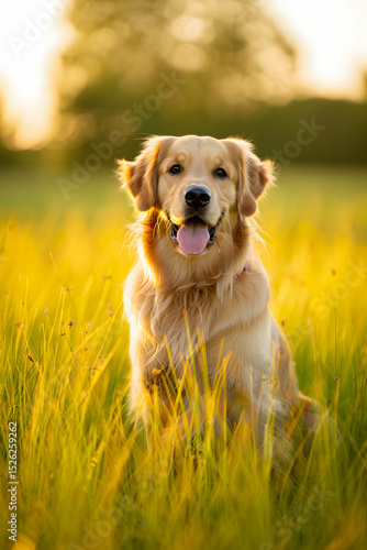 Golden Retriever Sitting in Sunny Meadow with Bokeh Background