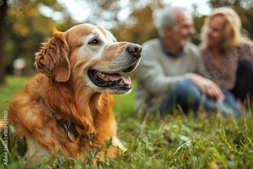 Golden retriever sitting on the grass in a park, looking happy and content.