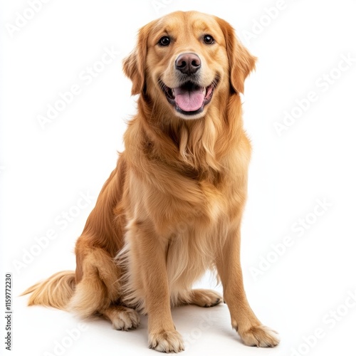 Golden retriever sitting on white background with happy expression