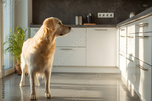 Golden retriever stands in modern kitchen during afternoon light