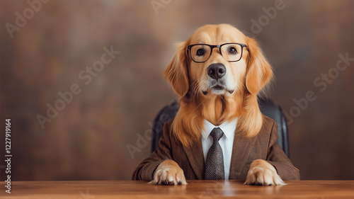 golden retriever, dog, goggles, suit, desk, professional, animal, pet, cute, brown background, business attire, humorous, sitting, portrait, furry, canino, smart, attaching, office, adorable, character, friendly, loyal, expressive, stylish, confident, relaxed, serious, charming, playful, well-dressed, elegant, sophisticated, warm, inviting, unique, whimsical, creative, fun, personality, animal portrait
