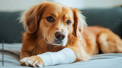 Golden retriever with bandaged paw resting on bed; injured pet care tips, canine health, recovery, veterinary advice.