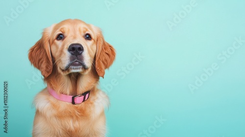 dog, pet, animal, golden retriever, cute, collar, pink, teal, background, portrait, canino, expressive, friendly, domestic, furry, loyal, puppy, sitting, head shot, well-groomed, bright, cheerful, happy, companionship, adorable, playful, breed, loving, expression, eye, fluff, innocent, nature, youth, tenderness, beauty, studio, peaceful, stylish, mammal, best friend, lifestyle, calm, tranquil, joy