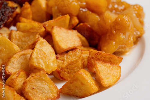 potato, roasted, food, crispy, gold, cooked, closeup, snack, meal, side, homemade, plate, dinner, lunch, vegetable, fried, cookery, crunchy, delicious, texture, warm, brown, hot, baked, oil, nourishment, rustic, savoury, preparation, chopped, bite, fresh, dish, comfort, tasty