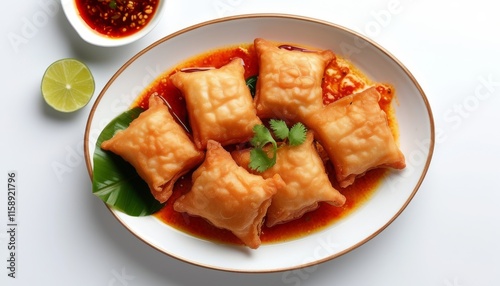 shrimp, cake, gold, crispy, sauce, spicey, lime, plate, epicure, cookery, food, culinary, delicious, savoury, meal, fresh, green, herb, garnish, elegant, topview, bright, vibrant, eatery, asian, traditional, share, party, detail, cooking, texture, oil, kitchen, dining, favor, seafood, yellow, smooth, modern, presentation, orange, red