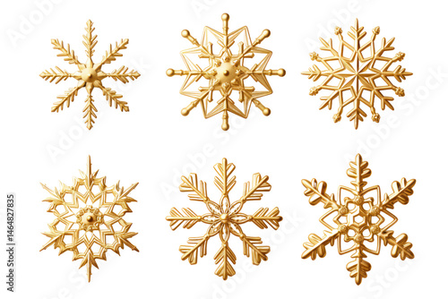 Golden Snowflake Collection: Six unique golden snowflakes, each with intricate details, create a festive and elegant collection, perfect for winter holiday designs.