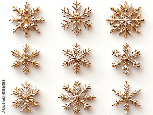 snowflake, arrangement, gold, white, background, winter, holiday, decorative, ornament, pattern, celebration, design, element, seasonal, christmas, new year, elegant, festive, closeup, isolated, symbol, snow, metallic, shiny, surface, structure, geometry, template, graphic, card, winterly, decoration, collection, artwork, clip art, frost, ice, cold, greeting, macro