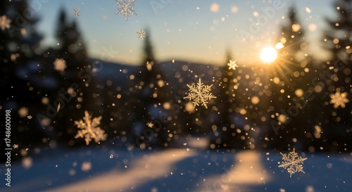 snow, snowflake, winter, forest, tree, sunset, sunrise, light, sun, gold, yellow, orange, blue, white, cold, frost, icy, glacé, nature, landscape, background, season, seasonal, holiday, christmas, festive, magic, magical, sparkle, glistering, shiny, bright, blur, blurred, bokeh, sharpened, depth, field, serene, peaceful, calm, tranquil, quiet, evening, dusk
