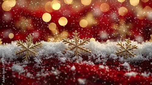 Golden Snowflakes on Red Glitter with Snowfall and Bokeh Lights
