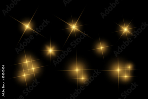 Golden sparkle lights, flashing lights, light effects, sunlight lens flare, glowing ray beams, sparkling starsicon on black background.