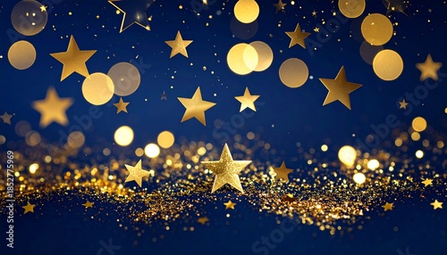 Golden stars, sparkling glitter, and festive bokeh lights on a deep blue background.