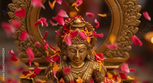 statue, gold, deity, flower, flower petals, red, orange, yellow, artifact, art, culture, religious, belief, prayer, worship, tradition, ceremony, celebration, festival, ancient, spiritual, symbol, ornate, carved, figure