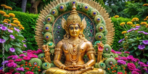 Golden statue of Hindu god Subramanya, also known as Kartikeya, sitting on a peacock, adorned with flowers and jewels, surrounded by lush greenery.