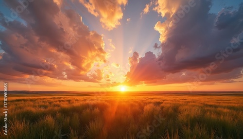 Golden sun sets over a vast grassy field. Dramatic clouds paint the sky with orange and purple hues. Radiant light beams pierce through the atmosphere. Nature beauty at dusk.