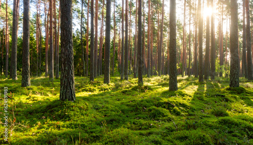 forest, tree, pine, conifer, timberland, wood, nature, landscape, moss, underbrush, flora, vegetation, plant, trunk, bark, evergreen, ecosystem, environment, wilderness, scenery, park, sun, sunlight, sunshine, sunbeam, sun ray, light, gold, morning, evening, dawn, dusk, shadow, backlit, flare, bright, aglow, glowing, green, yellow, brown, vibrant, peaceful, serene, tranquil, calm, quiet