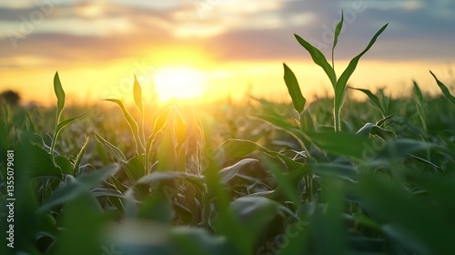 Golden sunlight filtering through green corn leaves in a field during sunset creating a warm atmosphere : Generative AI