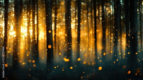Golden sunlight filtering through trees forest nature evening warm atmosphere