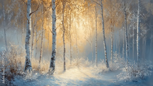 winter, snow, forest, tree, birch, sun, light, gold, path, wood, nature, landscape, scene, art, painting, cold, serene, tranquil, peaceful, magical, mystical, beautiful, stunning, breathtaking, amazing, awesome, idylli, picturesque, vibrant, bright, frosty, white, branch, twig, ground, atmosphere, ambience, harmony, shadow, silence, mystery, dreamy, whimsical