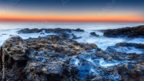 Golden sunrise and purple dusk paint the sky over the tranquil sea and ocean, reflecting on the water near the rocky coast