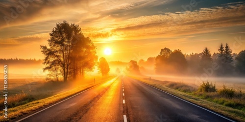 Golden sunrise illuminates rural asphalt highway with misty morning fog and trees in the background, dawn scenery, natural landscape