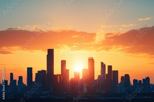 Golden sunrise illuminating modern city skyline with soft clouds