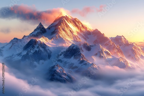 Golden sunrise lighting up majestic mountain peaks. Photorealistic nature view