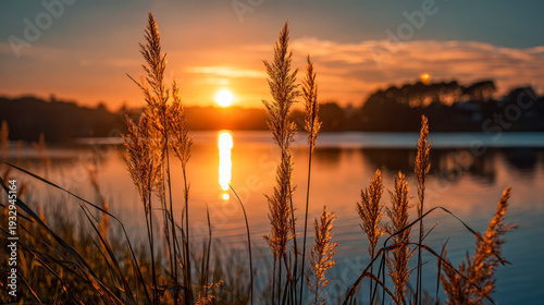 Golden sunrise over a tranquil lake reflecting warm sunlight filtered through tall grasses in a peaceful natural landscape at dawn