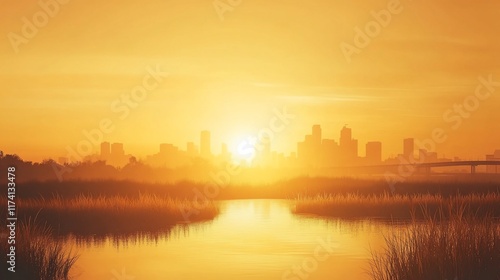 sunrise, sunset, city, skyline, urban, landscape, gold, hazy, calm, water, sun, morning, evening, light, orange, yellow, sky, horizon, building, tower, nature, scene, view, day, beautiful, peaceful, serene, tranquil, dawn, dusk, heat, warm, bright, colours, image, photo, photo, background, illustration, art