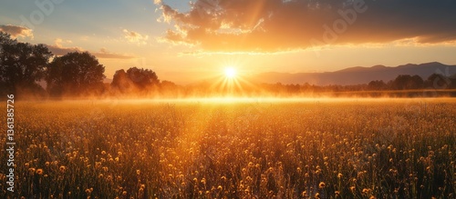 sunrise, misty, field, gold, landscape, nature, outdoors, scenic, morning, sunset, fog, country, rural, flower, meadow, cloud, sky, light, warm, summer, autumn, vibrant, beautiful, serenity, tranquil, photo, image, floral, panorama, spring, travel, vacation, golden hour, photo, scenic view, countryside, farmland, agriculture, rural area