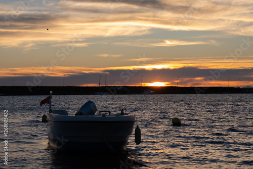 Golden sunrise over quiet harbor with lone boat on calm sea. Peaceful sunrise scene with fishing boat anchored in harbor on waters and gentle waves. Beautiful golden horizon, early morning at bay