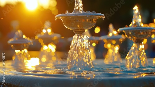 water, fountain, sunset, gold, spray, sun, light, bokeh, sparkle, shimmering, cascade, droplet, liquid, shine, glow, bright, illumination, colours, orange, yellow, blue, teal, water, evening, day, nature, park, scene, beautiful, peaceful, serene, tranquil, calm, relaxing, aesthetic, photo, image, picture