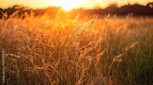 Golden sunset illuminating tall grass field; peaceful rural landscape. Use nature background, desktop wallpaper