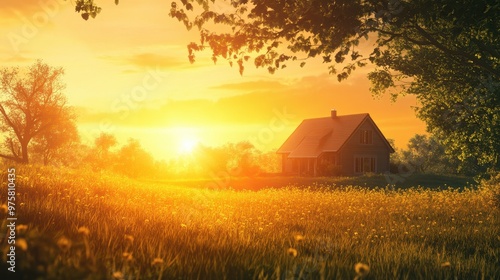 Golden Sunset Over a Tranquil Cottage